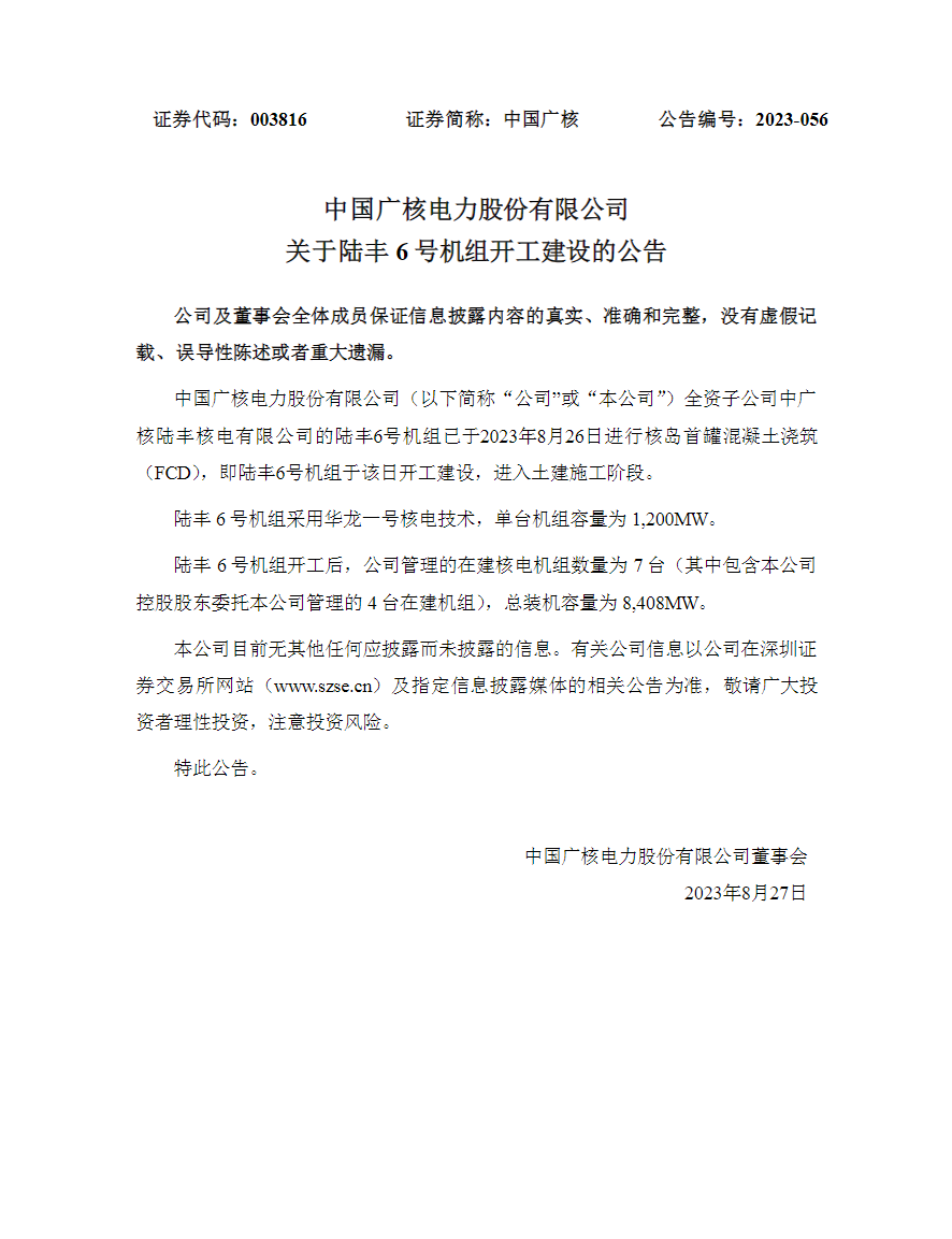 中廣核第34臺(tái)!陸豐核電6號(hào)機(jī)組開工建設(shè)