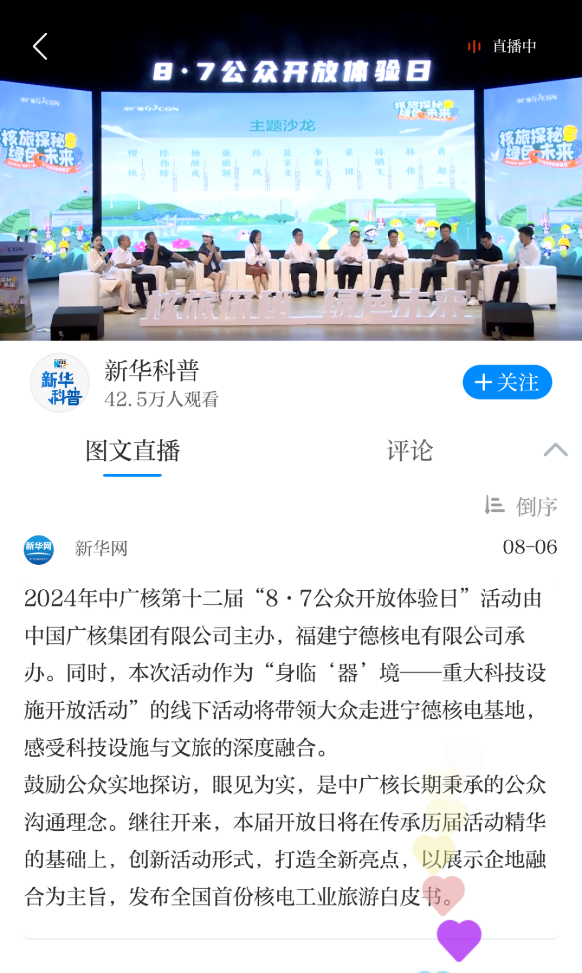 新華網(wǎng)、科技工作者之家、中國科技志愿服務、新浪廣東、核電那些事,以及中廣核官方微博、抖音、視頻號等多個平臺,對活動情況進行現(xiàn)場直播,超135萬人次在線觀看互動。