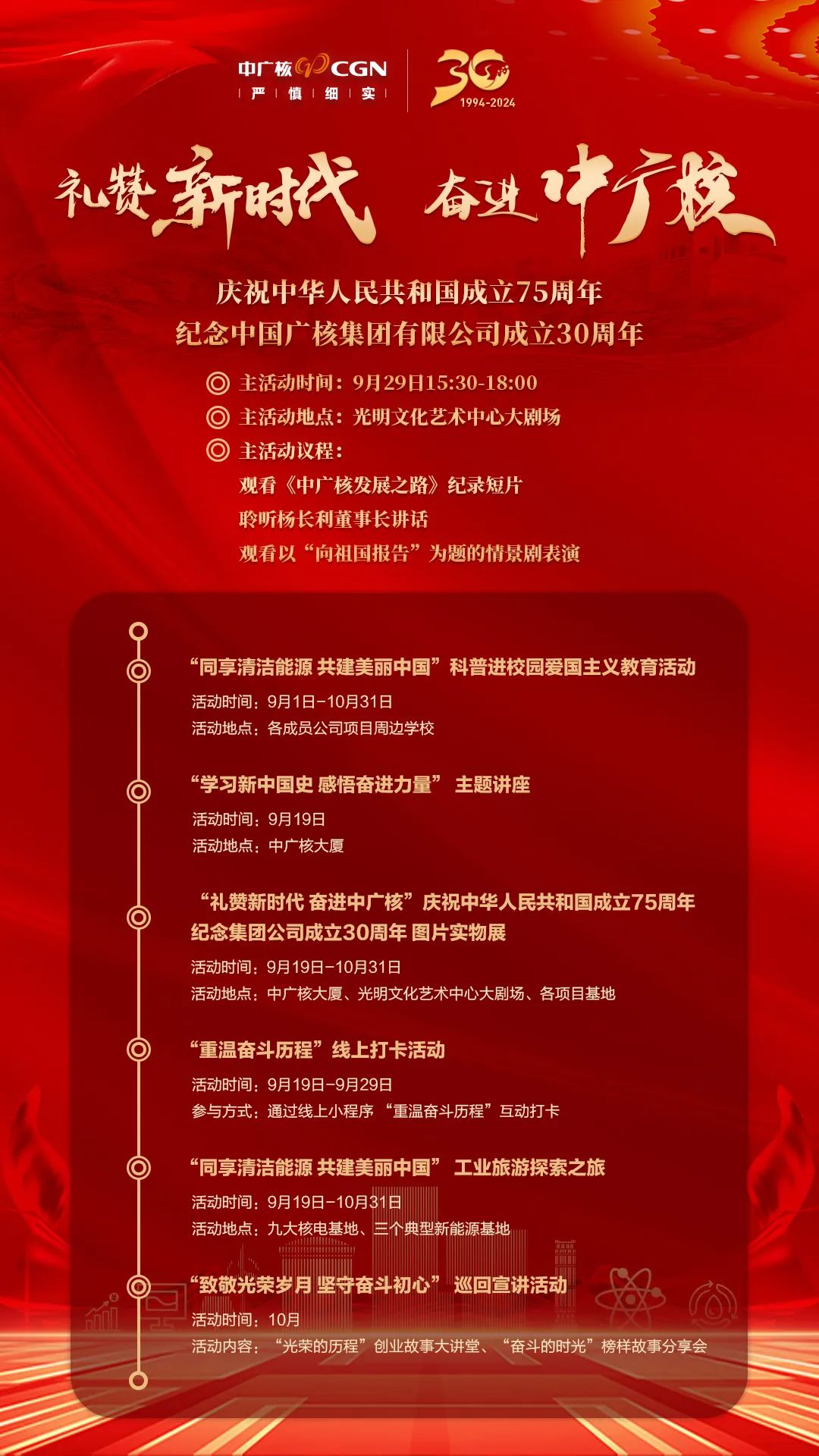9月19日,“禮贊新時代 奮進中廣核”慶祝中華人民共和國成立75周年、紀念中國廣核集團有限公司成立30周年主題活動開幕儀式在深圳中廣核大廈舉辦。集團公司黨委常委、副總經(jīng)理龐松濤出席活動并致開幕辭。集團公司團委書記、黨群工作部主任郭新剛主持開幕儀式。