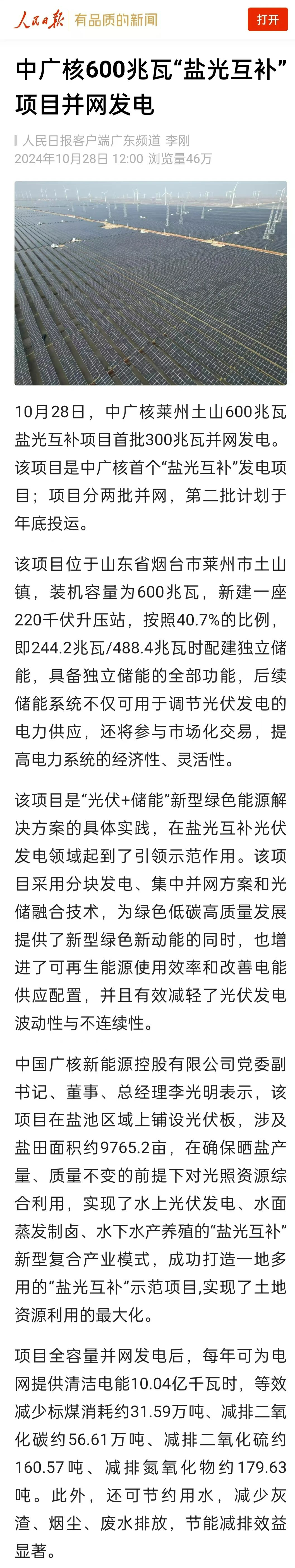 2024年10月28日,中國廣核集團(tuán)萊州土山600兆瓦鹽光互補(bǔ)項(xiàng)目首批300兆瓦并網(wǎng)發(fā)電。該項(xiàng)目是山東省2022年市場化競配單體最大光伏項(xiàng)目、2024年山東省重大項(xiàng)目之一、山東省最大的配套儲能項(xiàng)目,也是中廣核首個(gè)“鹽光互補(bǔ)”發(fā)電項(xiàng)目,項(xiàng)目分兩批并網(wǎng),第二批計(jì)劃于年底投運(yùn)。