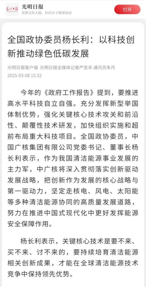 2025年全國(guó)兩會(huì)期間,全國(guó)政協(xié)委員、中國(guó)廣核集團(tuán)有限公司黨委書(shū)記、董事長(zhǎng)楊長(zhǎng)利積極履職盡責(zé),圍繞科技創(chuàng)新、清潔能源融合發(fā)展以及人工智能技術(shù)應(yīng)用落地等熱點(diǎn)問(wèn)題積極發(fā)聲,人民日?qǐng)?bào)、新華社、中央廣播電視總臺(tái)新聞聯(lián)播、科技日?qǐng)?bào)等多家媒體關(guān)注和報(bào)道,產(chǎn)生廣泛的社會(huì)影響。